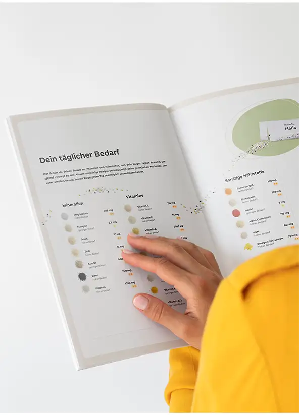 Statt pauschaler Ratschläge erhalten Sie einen umfassenden Ergebnisbericht mit über 180 Seiten – wissenschaftlich fundiert, leicht verständlich und exklusiv für Sie aufbereitet. Um Ihren Erfolg im Alltag zu maximieren, können Sie ergänzend einen personalisierten Kalorienblocker sowie ein individuelles Kochbuch mit über 100 Rezepten erhalten, die exakt auf Ihre genetische Stoffwechselsituation abgestimmt sind.